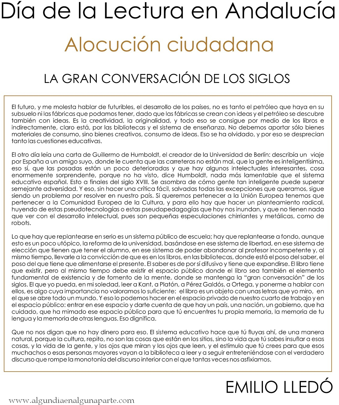 Alocución del Día de la Lectura en Andalucía 2015 por Emilio LLedó.